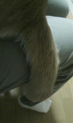うちの辺りからも流しに行き始めた5時半頃、テーブルの下に潜り込んでしまったので、抱っこしてやるから出ておいでと引きずり出してみたならば、腕にしがみついて、前脚がぎゅうぅ。尻尾に至っては……